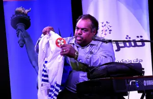 Daryl Davis holding up KKK robes at Blues and Rock for Humanity in November 2017.