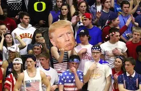 White high school students hold up a picture of Donald Trump and chant "build a wall" during a basketball game against a predominantly Latino school in Indiana.