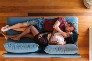 If you find that even non-sexual touch has waned, I suggest scheduling a 20-minute cuddle session every day for a week. This period of time is not about sex or even making out; it’s about becoming reacquainted with each other’s bodies in a no-pressure way. I encourage you to keep talking to a minimum, other than communicating what feels good and offering appreciation. Bring mindfulness to the experience and remember to breathe and relax. You may find that after a week of this you feel more connected and that my previous suggestions are a bit more in reach.
